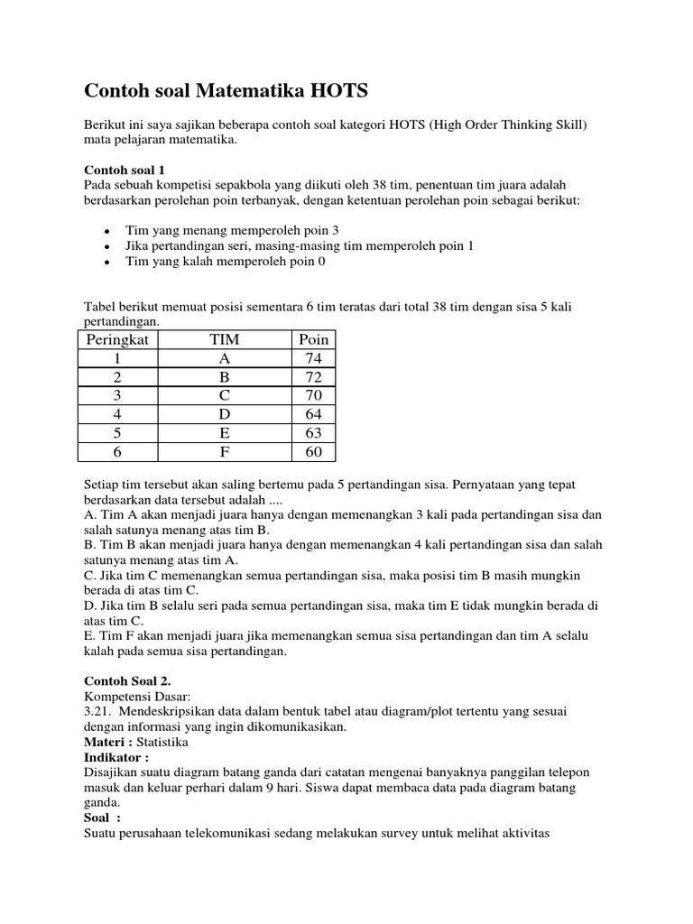 Contoh Soal Matematika Higher Order Thinking Skills Hots Pdf