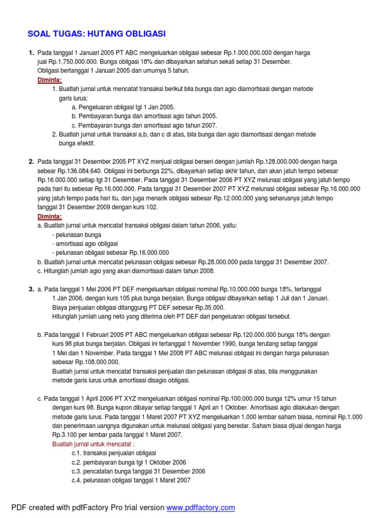 Contoh soal obligasi berseri. Obligasi adalah surat utang jangka panjang yang diterbitkan dengan nilai nominal nilai pari par value oleh suatu lembaga dengan waktu jatuh tempo. Obligasi menunjukkan jumlah nominal bunga dan tanggal pembayarannya dan perjanjian perjanjian lain. Biani naeli muna 125020300111098 untuk memenuhi tugas pengantar akuntansi akuntansi fakultas ekonomi dan bisnis universitas brawijaya biaini neli 517eb577 assalamualaikum wrwb.
