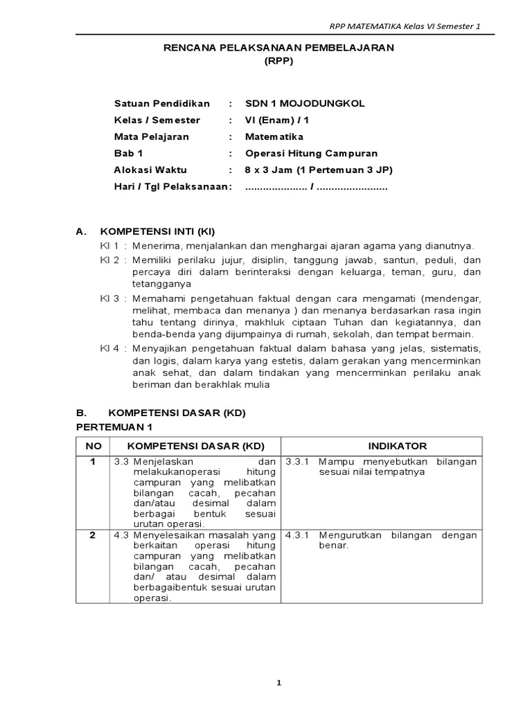 Rpp Matematika Kelas 6 Sd Mi Kurikulum 2013 Revisi 2019 2020