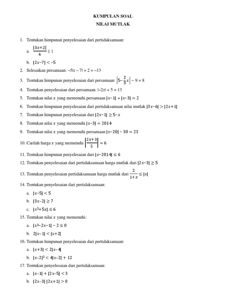 Download Soal Pertidaksamaan Nilai Mutlak Satu Variabel Pdf